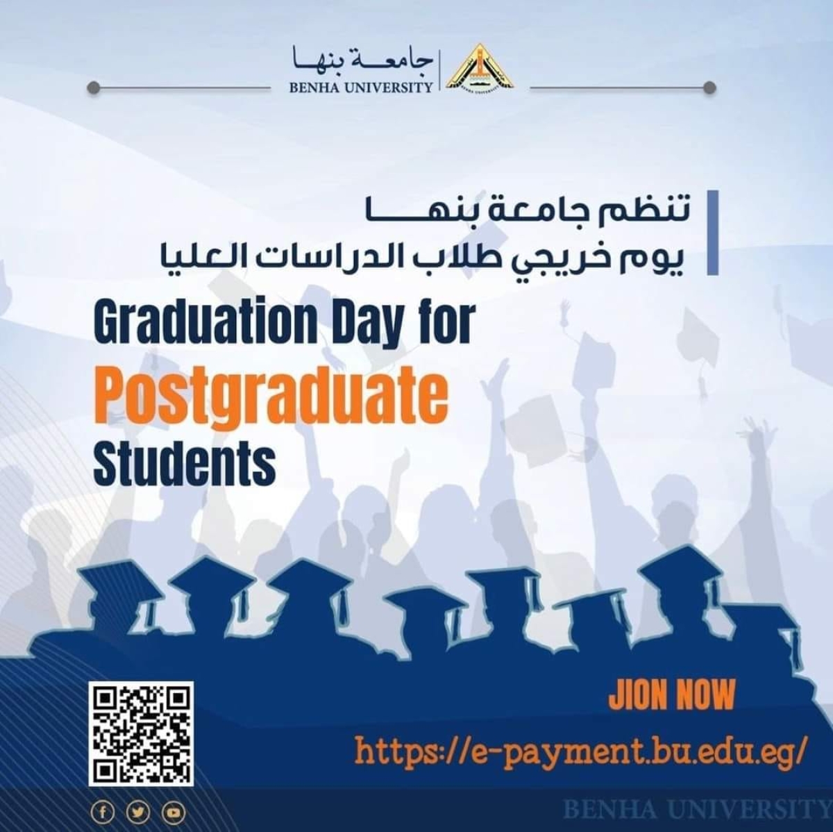 ينظم قطاع الدراسات العليا و البحوث بجامعة بنها حفل خريجين الدراسات العليا الأول بكليات الجامعة بقاعة المؤتمرات بكلية التجارة ببنها، يشمل الحفل كل الحاصلين علي مختلف الدرجات العلمية (دبلوم - ماجستير - دكتوراة) بكليات الجامعة.